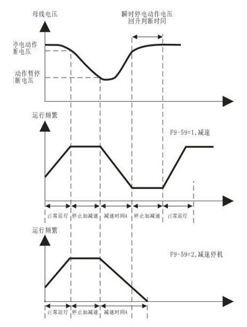 6.1此功能只在停電瞬間變頻器不會故障停機,而是降低輸出頻率,通過負(fù)載回饋能量,補充電壓降低,以維持變頻器短時間內(nèi)繼續(xù)工作。